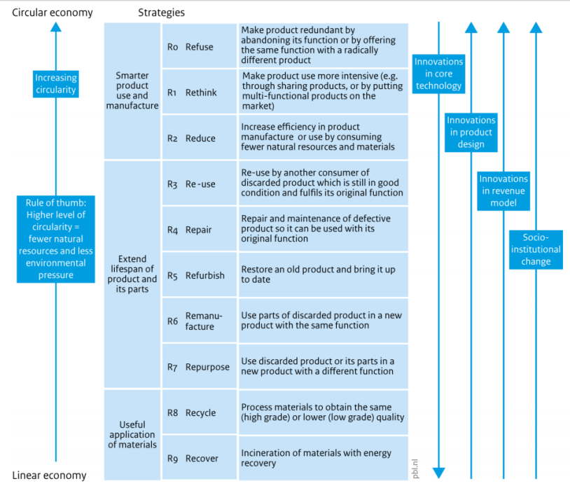 De sprekers in de ochtend gaven een breed beeld van de noodzaak en drivers voor een transitie naar een circulaire economie. De doelstelling van de Nederlandse regering is om in 2050 een circulaire economie te zijn. Welke stappen daarvoor nodig zijn werd door de eerste spreker, Hester Klein Lankhorst, directeur van het Kennisinstituut Duurzame Verpakken, toegelicht. De Ladder van Lansink, de standaard op het gebied van afvalhiërarchie, is inmiddels uitgebreid tot 9 R’en (zie Figuur 1).