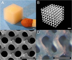 Computer designed tissue engineering scaffold built by stereolithography using a degradable polymeric resin (A). MicroCT analysis shows that the built structure precisely matches the design (B). SEM images show the layer-by- layer nature of the building process (C). The scaffolds show excellent cell adhesion and proliferation (D). |